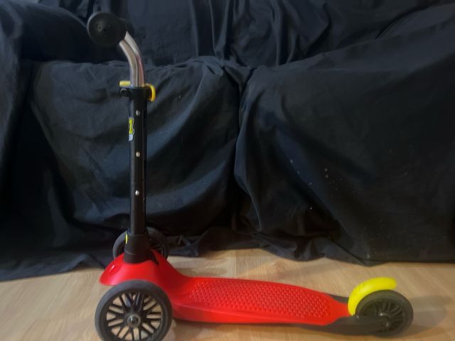 Detalles del productoPatinete de tres ruedas en color rojo con detalles en amarillo. Ideal para los más pequeños.