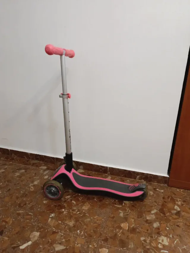 Patinete infantil de tres ruedas con un diseño moderno y llamativo. - Color principal: rosa. - Plataforma antideslizante. - Manillar ajustable en altura.