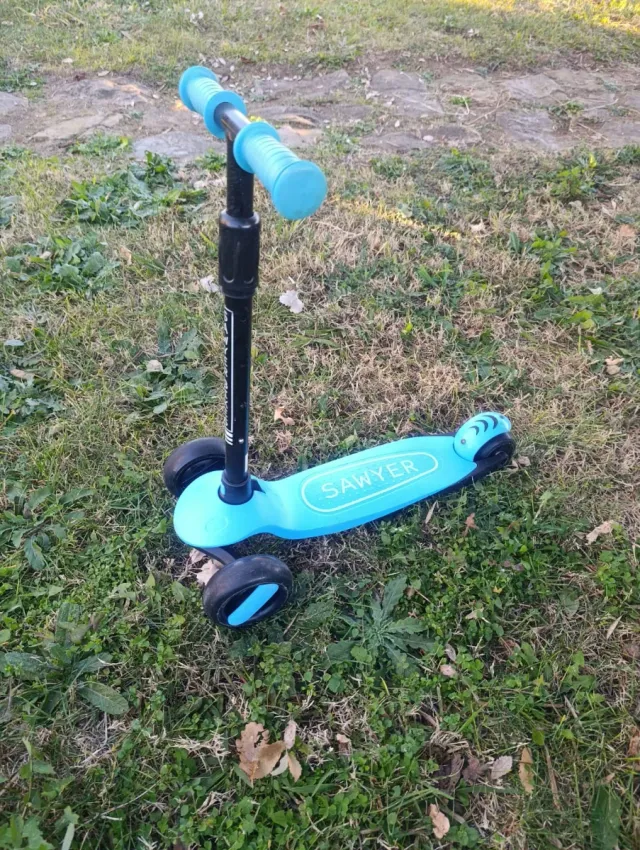 Detalles del productoPatinete infantil de tres ruedas,plegable, color azul y negro, marca SAWYER