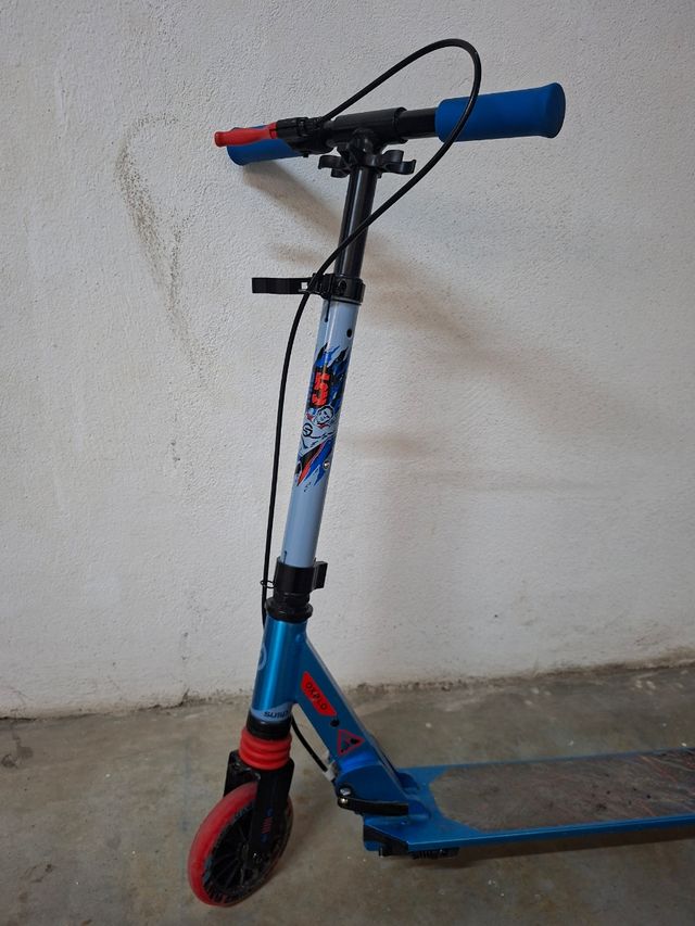 Detalles del productoPatinete de color azul, ideal para niños. Cuenta con un diseño llamativo y ruedas rojas.