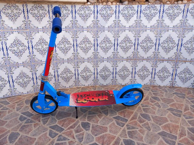 Detalles del productoPatinete infantil de color azul con ruedas grandes.