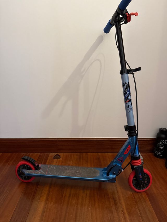 Patinete de dos ruedas en tonos azul y rojo, diseñado para niños. - Manillar ajustable. - Ruedas de goma. - Plataforma antideslizante.
