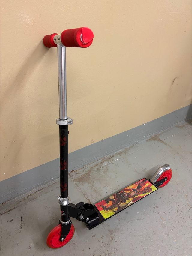 Patinete para niños con diseño de Bakugan. Está en buenas condiciones y listo para usar. - Diseño de Bakugan. - Color negro y rojo. - Ruedas de plástico rojo.