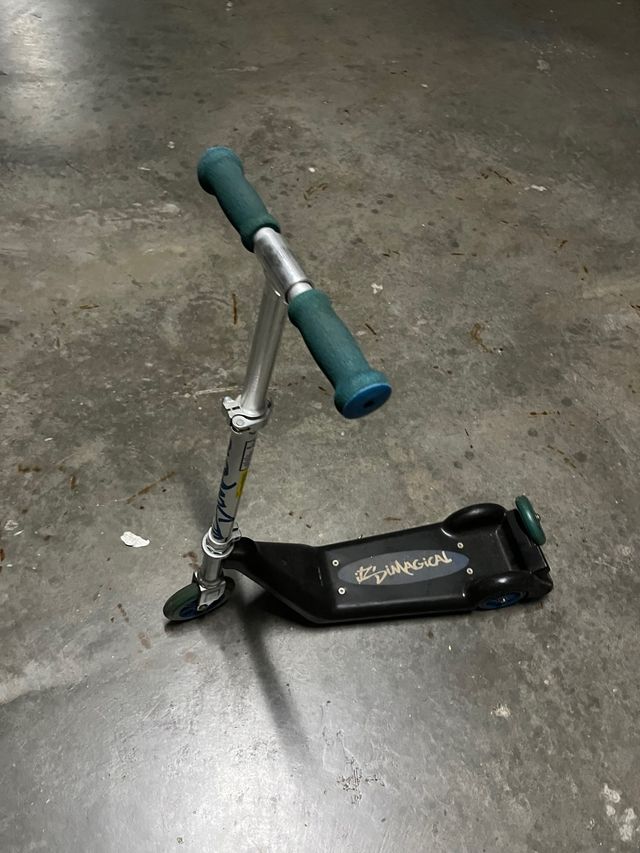 Patinete infantil Bizmagical en buen estado. Ideal para niños. - Diseño ligero y fácil de manejar. - Color negro con detalles azules y verdes. - Ruedas resistentes.