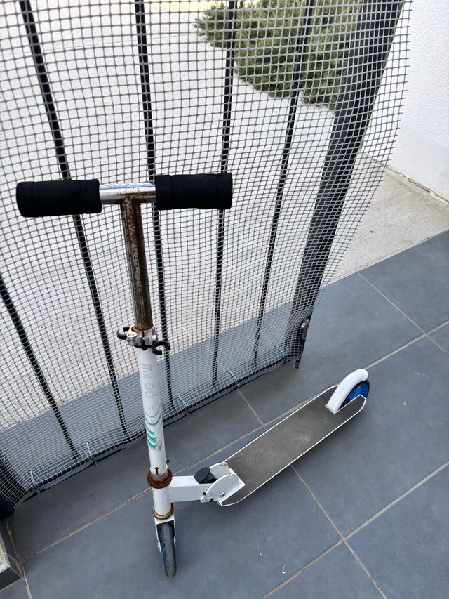 Detalles del productoPatinete infantil con manillar negro y ruedas blancas y azules. Ideal para los más pequeños.