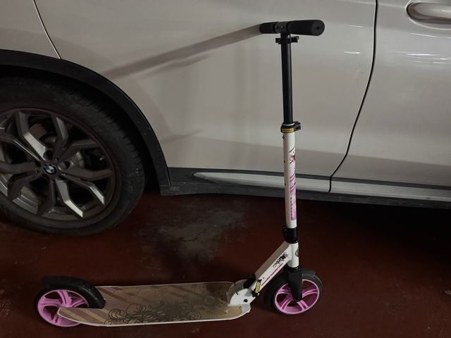 Patinete de dos ruedas con diseño infantil. - Color blanco con detalles en rosa y dibujos. - Manillar negro ajustable. - Ruedas de color rosa. - Peso Max 70kg