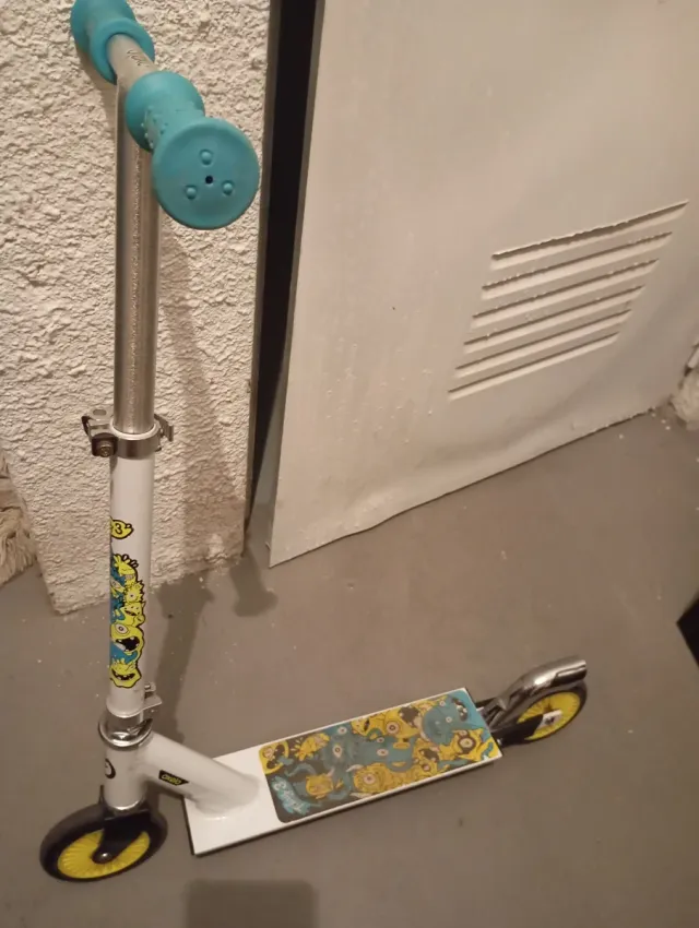 Patinete infantil con un divertido diseño. - Ruedas de color amarillo. - Puños de color turquesa. - Plataforma con estampado de personajes.