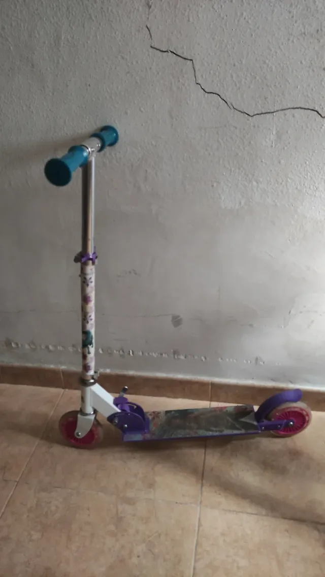 Patinete infantil con un diseño divertido y colorido. - Ruedas de color morado. - Se puede plegar - Plataforma con Raya Disney - Puños de goma para un mejor agarre.
