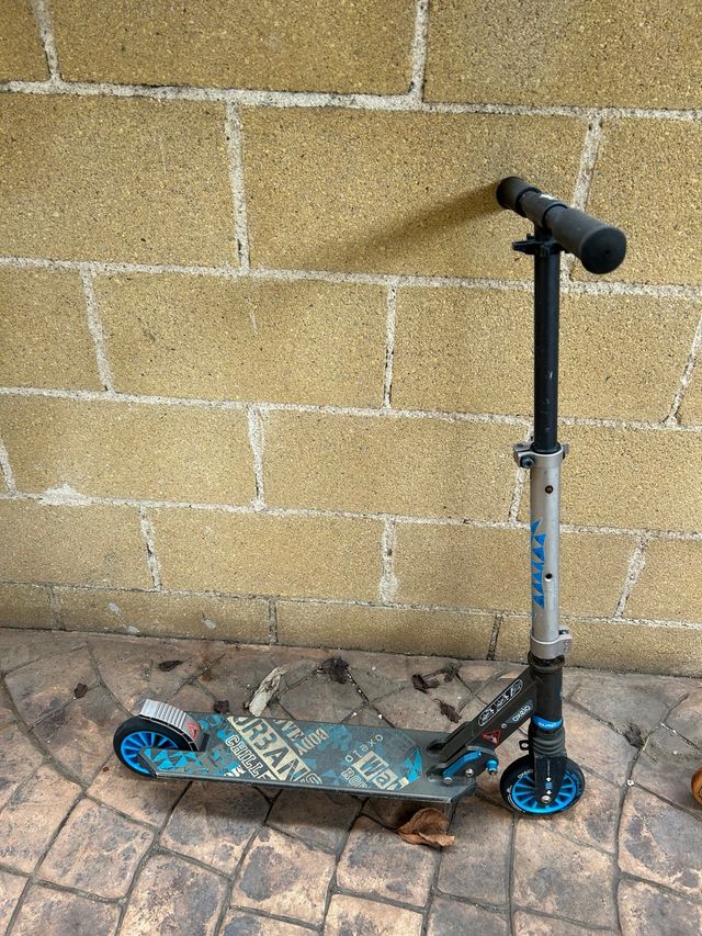 Patinete infantil de Decathlon, ideal para los más pequeños. - Diseño en color azul y gris. - Plataforma con gráficos. - Ruedas de color azul.