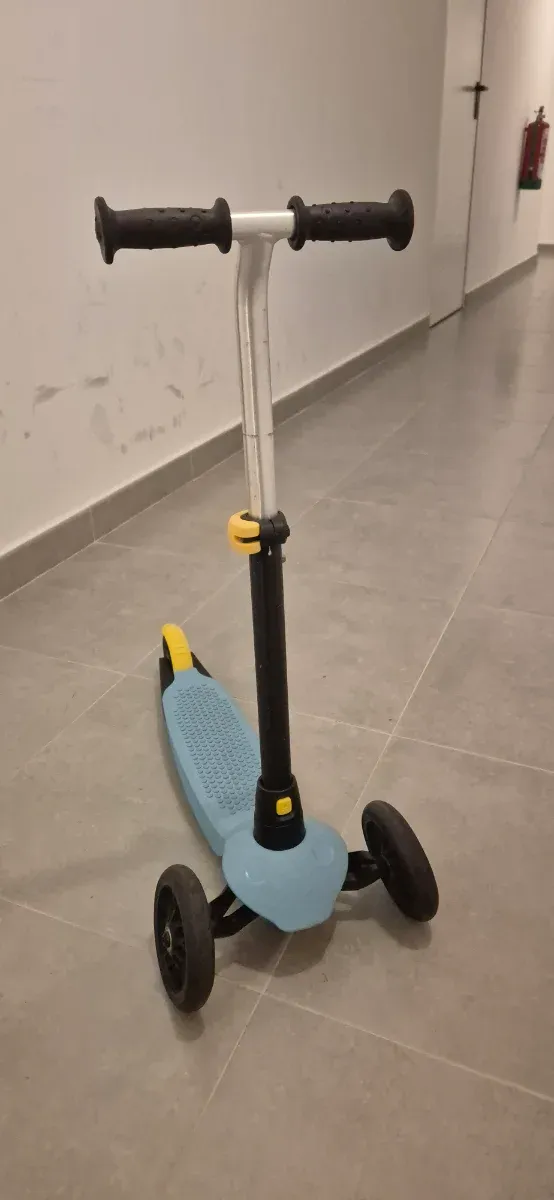 Patinete infantil de tres ruedas, ideal para los más pequeños. - Color azul y amarillo. - Manillar ajustable. - Plataforma antideslizante.