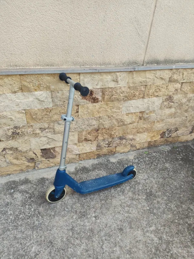 Patinete de Decathlon en color azul, diseñado para niños. - Manillar ajustable. - Ruedas de goma. - Plataforma antideslizante.