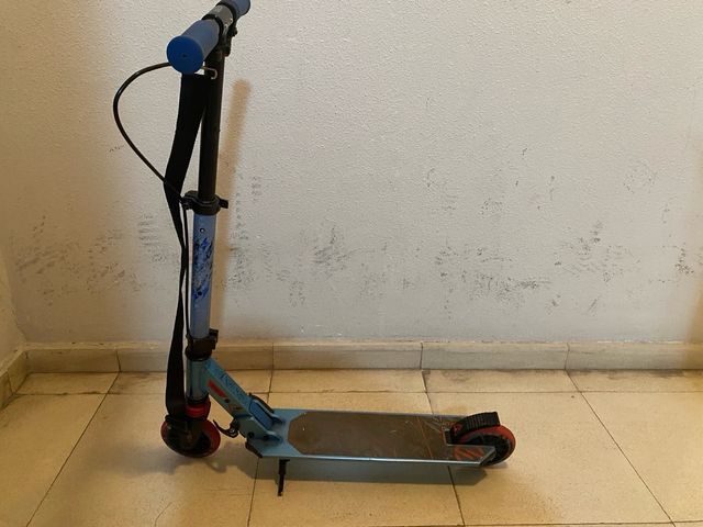 Patinete infantil de Decathlon en color azul. Ideal para los más pequeños. - Manillar ajustable en altura. - Ruedas de goma. - Plegable para facilitar su transporte.