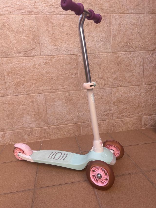 Patinete infantil de tres ruedas en color menta y rosa. - Manillar ajustable. - Ruedas con luces LED. - Accesorio original porta objetos de regalo.