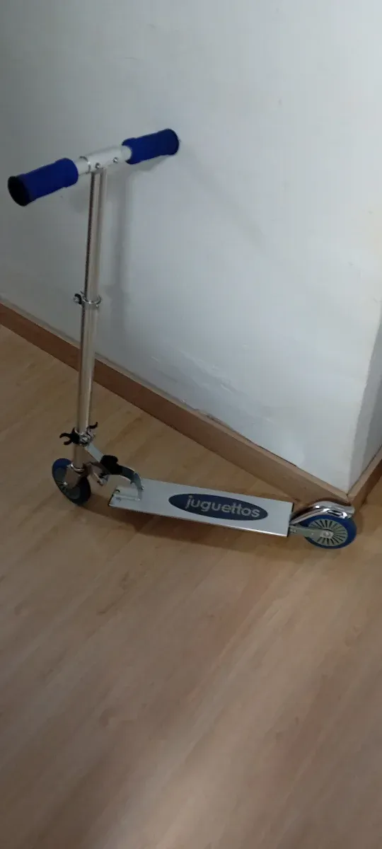 Patinete infantil de la marca Juguettos, en buen estado. - Manillar ajustable en altura. - Puños de goma azul. - Plataforma plateada. - Ruedas con detalles azules.