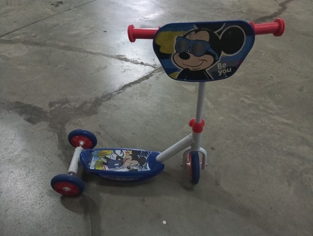 Detalles del productoPatinete infantil de Mickey Mouse, ideal para niños pequeños. Está en buen estado y listo para usar.