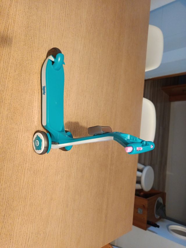 Patinete de tres ruedas en color azul turquesa y blanco. - Diseño moderno y divertido. - Ruedas con detalles en blanco y negro. - Plataforma con detalles en rosa.