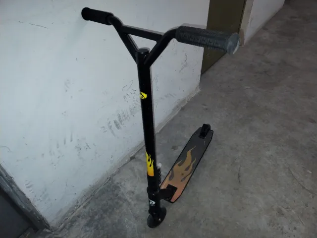 Patinete infantil de color negro con un diseño llamativo de llamas en la base. Ideal para los más pequeños. - Manillar negro. - Base con diseño de llamas.