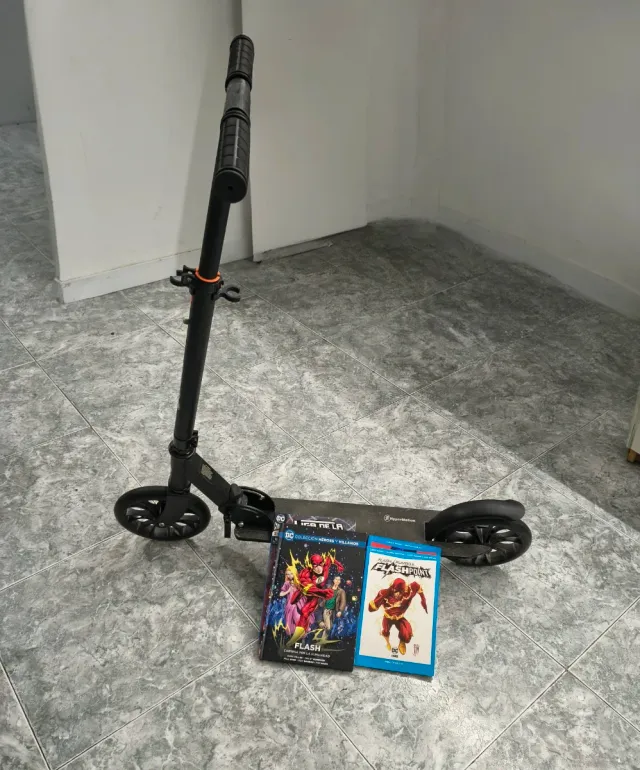 Detalles del productoPatinete plegable de color negro, ideal para niños. Incluye dos cómics de Flash, uno de liga d ela justicia y uno de bane de batmán.