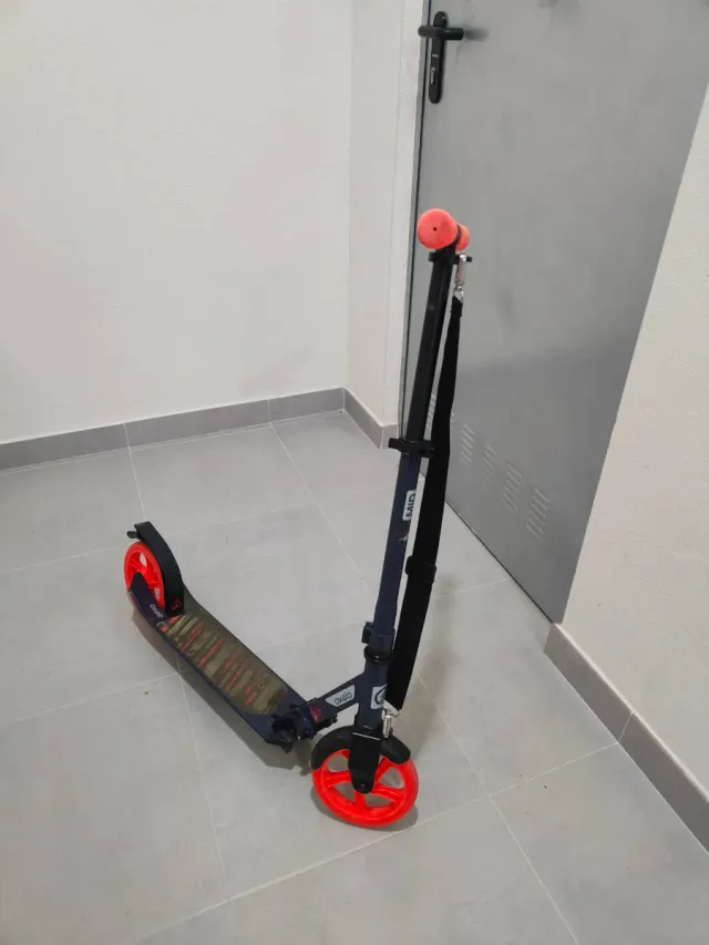 Patinete infantil con ruedas de color naranja y estructura negra. - Ruedas de 125 mm. - Plataforma antideslizante. - Manillar ajustable en altura.