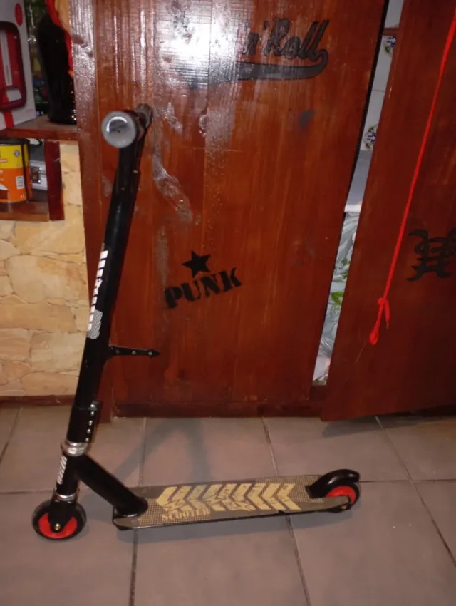 Patinete de dos ruedas con diseño llamativo. - Manillar ajustable en altura. - Plataforma con diseño antideslizante. - Ruedas de goma. - Freno trasero.