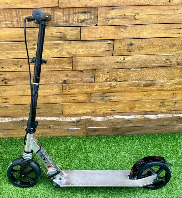 Detalles del productoPatinete plegable de color plateado y negro, ideal para desplazamientos urbanos.