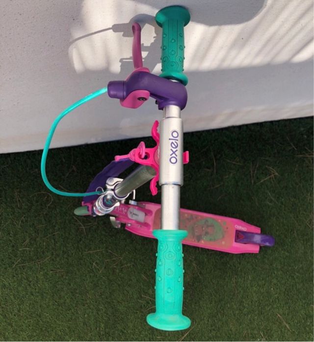 Patinete infantil de la marca Oxelo, ideal para niñas. - Color rosa y morado. - Puños de goma verde menta. - Ruedas de goma.
