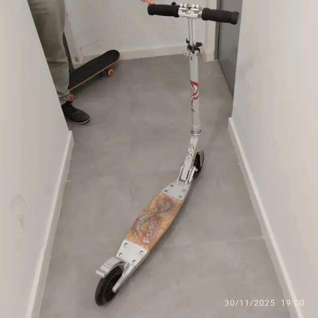 Patinete infantil con un diseño moderno y llamativo. - Plataforma con diseño de madera y gráficos. - Manillar ajustable en altura. - Ruedas de goma para un mejor agarre.