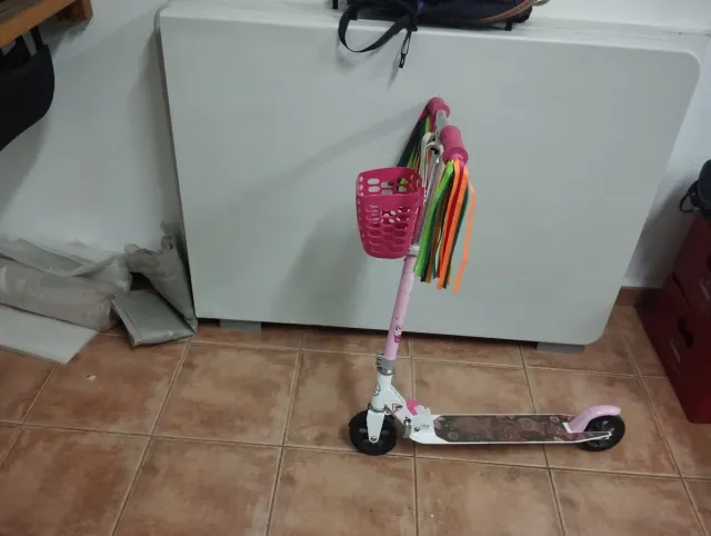 Detalles del productoPatinete infantil de color rosa, ideal para niñas. Cuenta con una cesta delantera para llevar objetos.