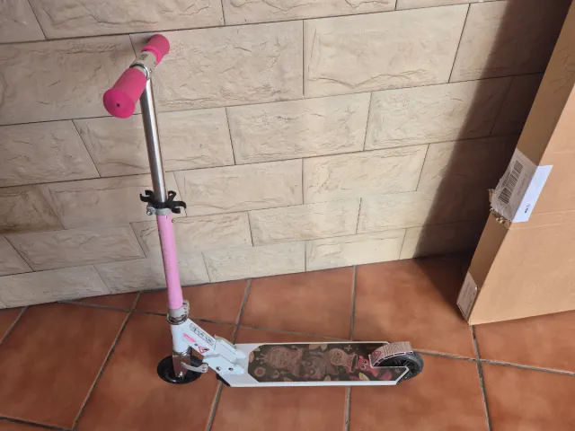 Patinete infantil con manillar rosa y base blanca. Ideal para paseos divertidos. - Manillar con puños rosas. - Base con diseño. - Ruedas negras.