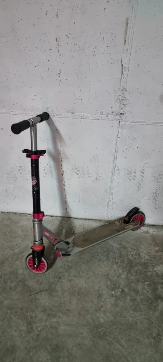 Patinete de dos ruedas con manillar ajustable. - Color rosa y negro. - Ruedas con detalles en rosa. - Plataforma con diseño.