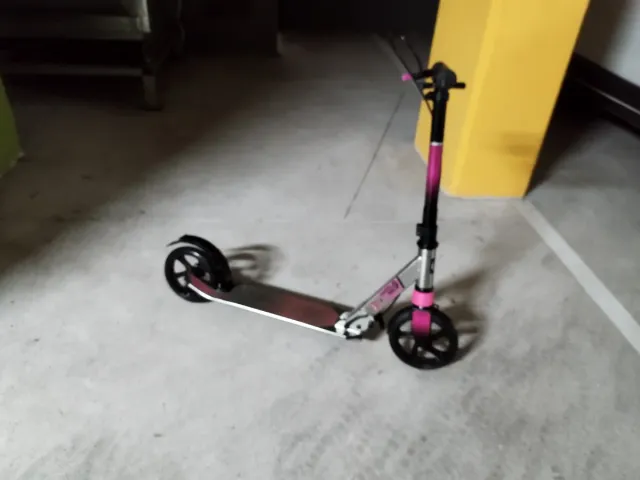 Patinete de dos ruedas con manillar ajustable y freno trasero. - Color principal: plateado con detalles en rosa. - Ruedas de goma negra. - Plataforma antideslizante.
