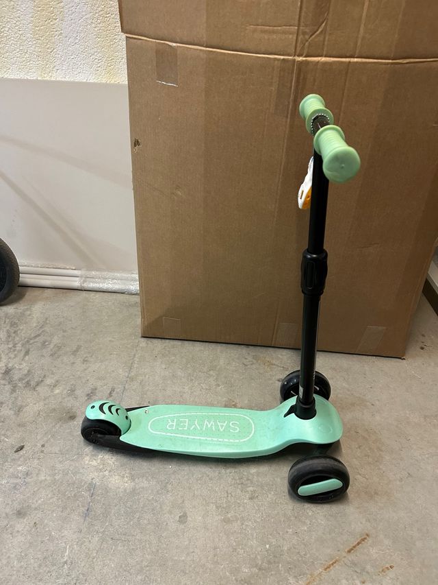 Detalles del productoPatinete de tres ruedas con diseño divertido y color menta, marca Sawyer.