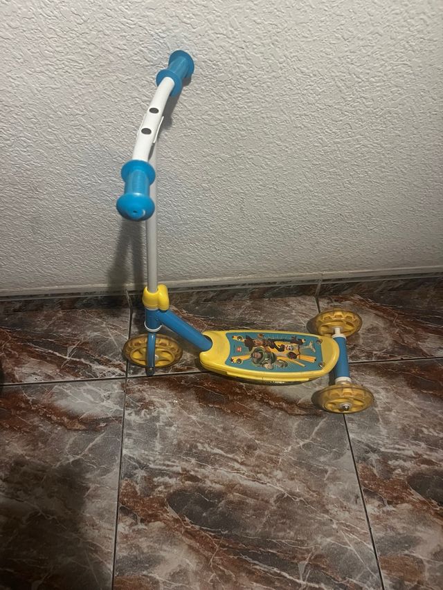 Detalles del productoPatinete de tres ruedas con diseño de Toy Story, ideal para los más pequeños. Su estructura es de color amarillo y azul.