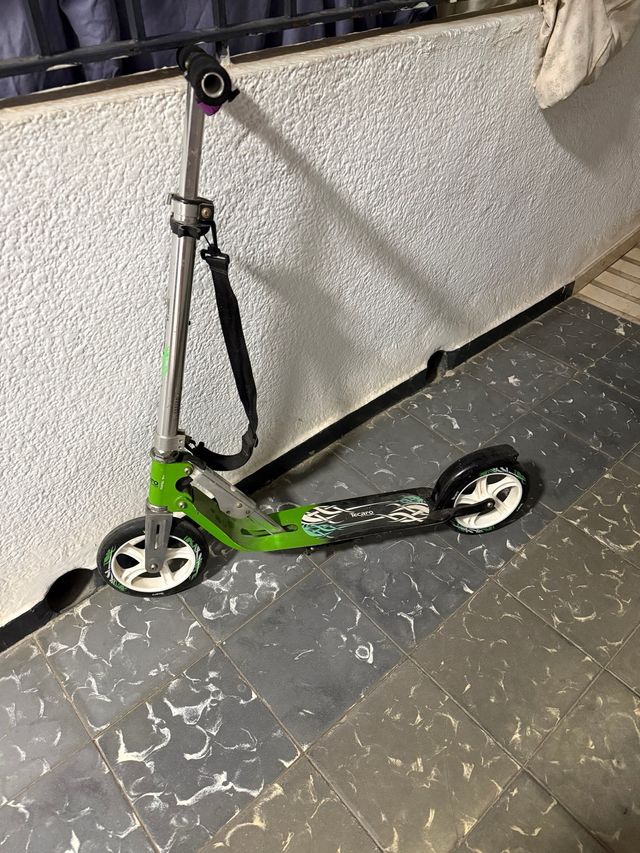 Detalles del productoPatinete de dos ruedas en color verde, ideal para niños. Cuenta con un diseño llamativo y es fácil de manejar.