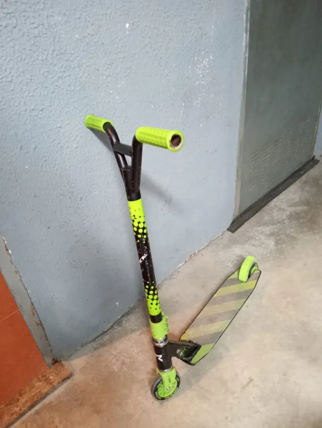 Patinete con un diseño llamativo en color verde y negro. - Puños de goma verde. - Ruedas verdes. - Plataforma con diseño de rayas grises y verdes.