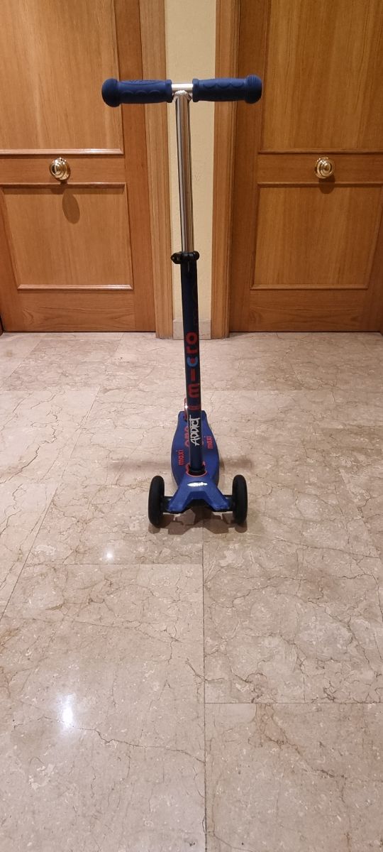 Detalles del productoPatinete Maxi Micro de tres ruedas en azul marino y rojo. Está en muy buen estado.