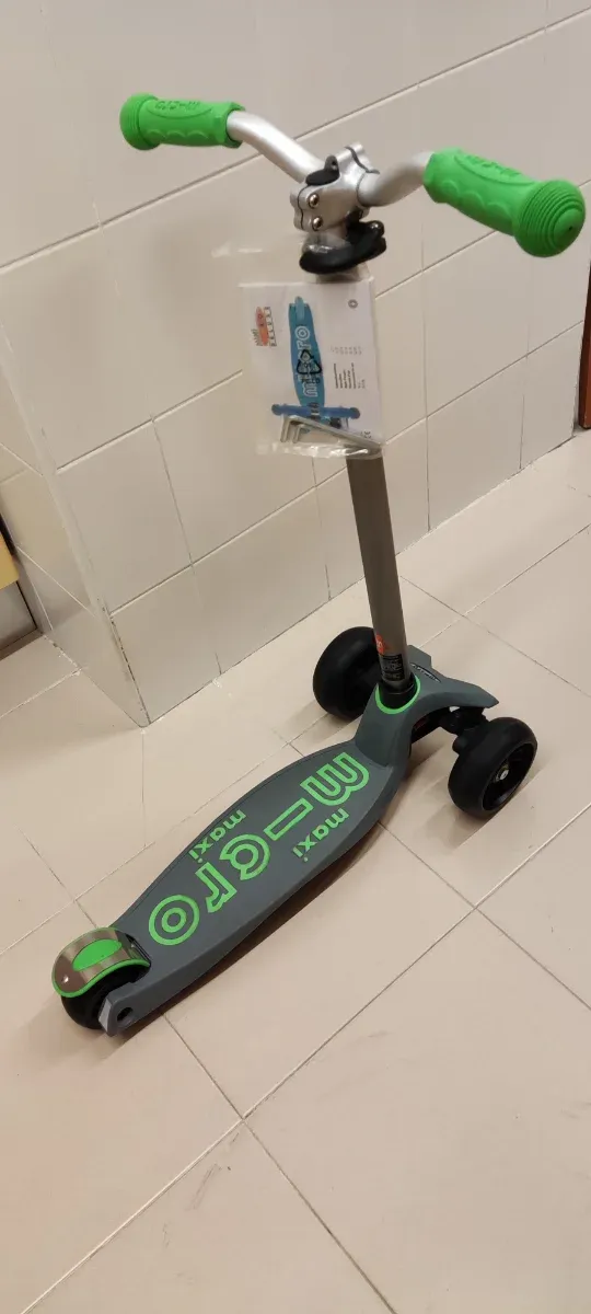 Patinete infantil Maxi Micro en perfecto estado, prácticamente sin uso. Costó 139€ - Color gris con detalles en verde. - Ruedas negras.