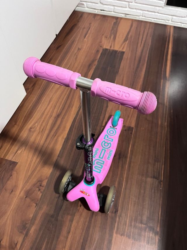 Patinete infantil de la marca Micro, modelo Mini. - Color lila. - Tres ruedas para mayor estabilidad. - Puños rosas. - Ruedas delanteras y traseras.
