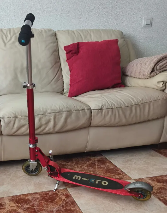 Patinete de la marca Micro en color rojo. Ideal para desplazamientos urbanos. - Plataforma antideslizante. - Ruedas resistentes. - Manillar ajustable.