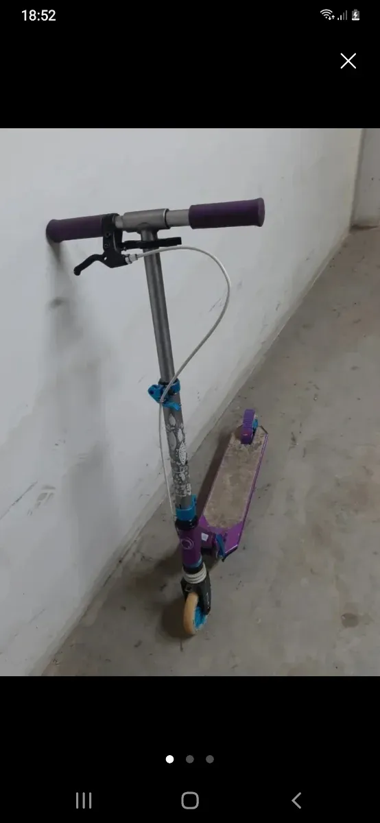 Patinete de color morado con sistema de freno. - Manillar con puños morados. - Ruedas de color morado y naranja. - Plataforma de color morado.