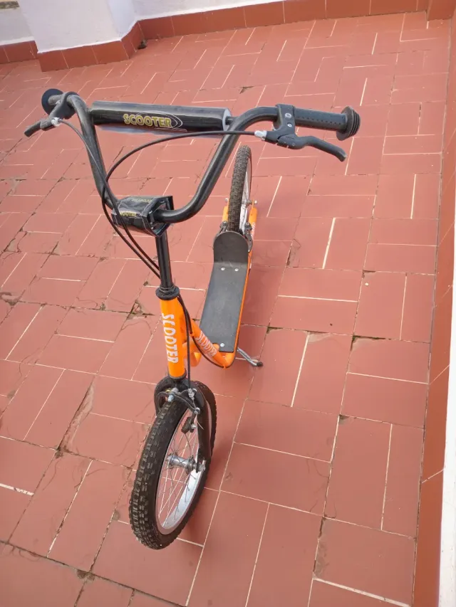 Detalles del productoPatinete de color naranja con un diseño llamativo y ruedas de buen tamaño para un desplazamiento suave.