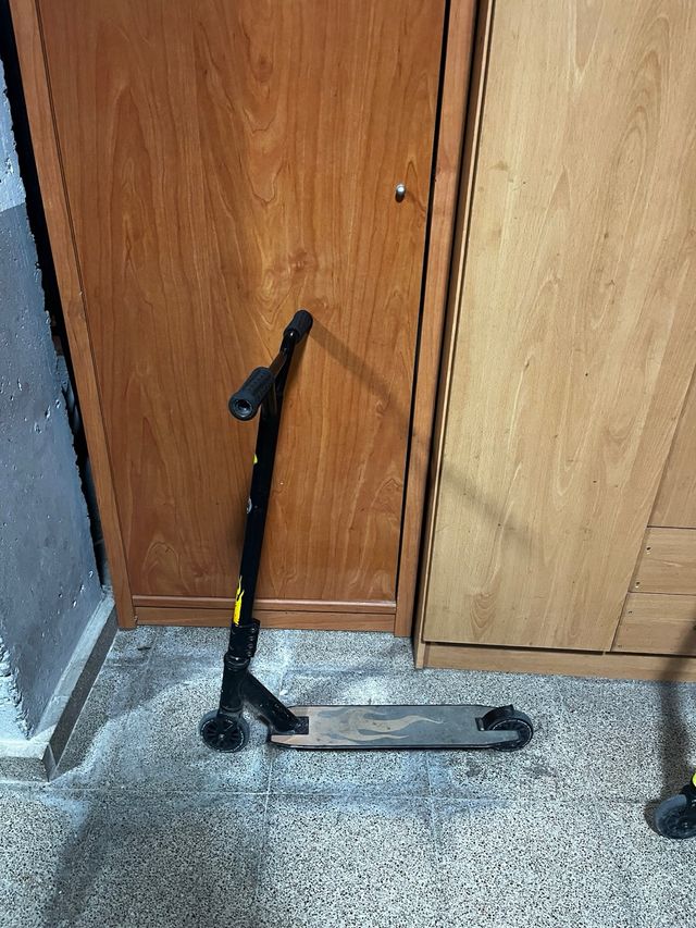 Patinete de color negro, ideal para desplazarse. - Manillar con puños. - Plataforma para los pies. - Ruedas delanteras y traseras.