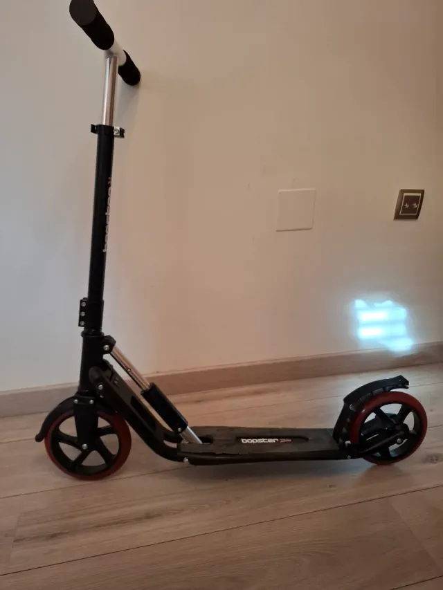 Patinete plegable de color negro con detalles en rojo. - Manillar ajustable. - Ruedas de goma. - Plataforma antideslizante.