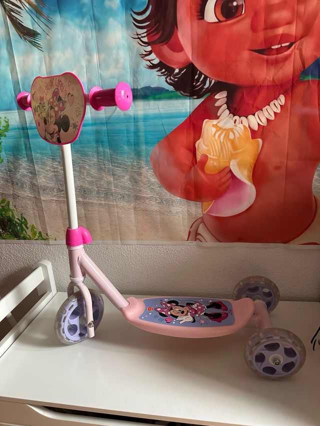 Patinete de tres ruedas con diseño de “Minnie Mouse” en color rosa. - Manillar ajustable en altura. - Ruedas transparentes con luces. - Plataforma decorada con Minnie Mouse.