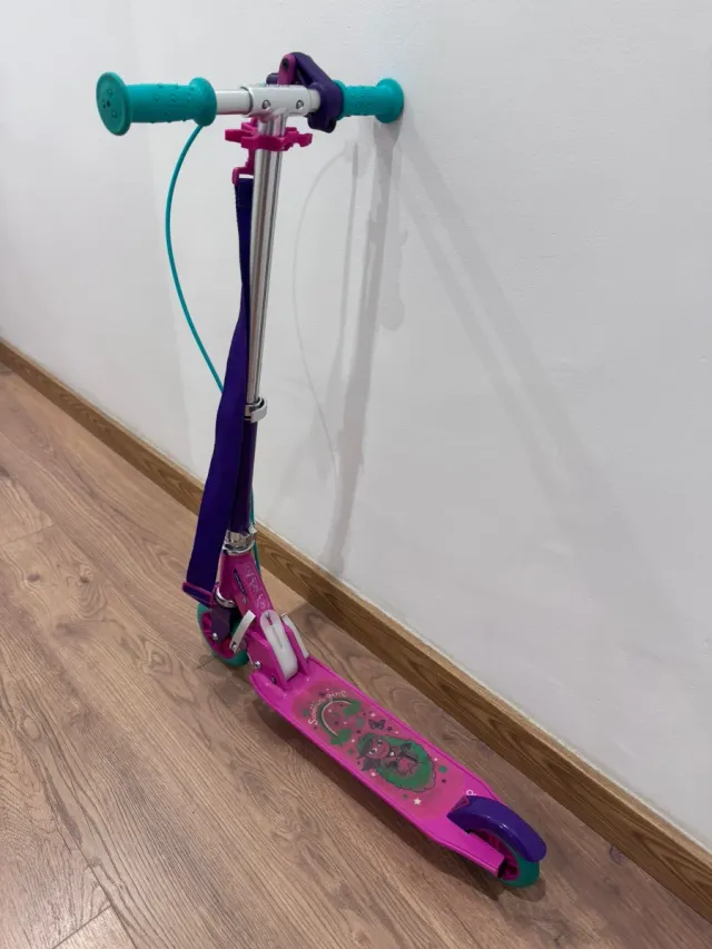 Detalles del productoPatinete de dos ruedas en color rosa y morado, ideal para niñas. Cuenta con un diseño divertido y llamativo.