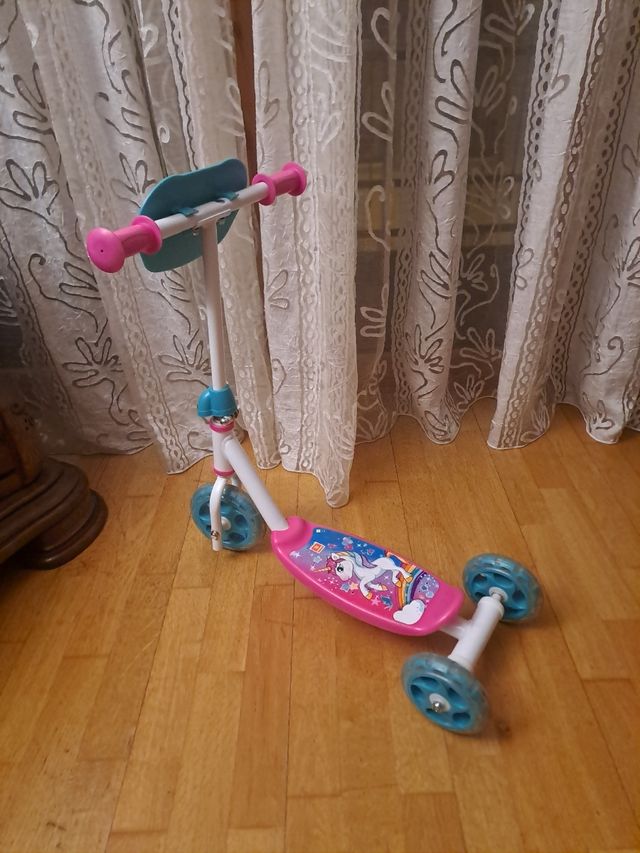 Detalles del productoPatinete de tres ruedas con un divertido diseño de unicornio, ideal para los más pequeños.