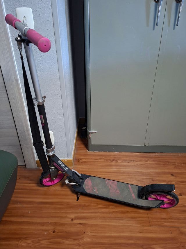 Patinete de la marca Oxelo. - Ruedas de color rosa. - Puños de color rosa.