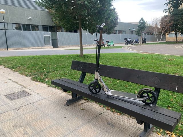 Patinete de la marca Oxelo. - Color plateado y negro. - Ruedas negras. - Plegable - con freno