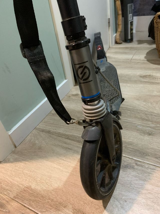 Patinete de la marca Oxelo. - Color gris y negro. - Con suspensión delantera. - Correa de transporte. - En buen estado con señales de uso como se ve en las fotos