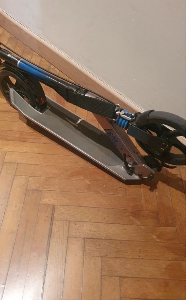 Patinete de la marca Oxelo, ideal para desplazamientos urbanos. - Plataforma de aluminio. - Ruedas de goma. - Sistema de plegado. - Correa de transporte.